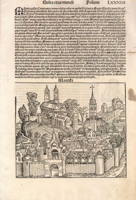 This is an imaginary view of the city of Mantua, Italy. On verso are portraits of poets and teachers.