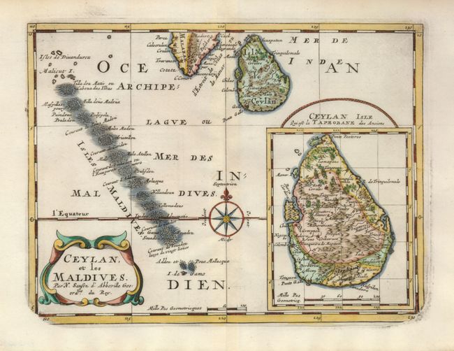 Exquisite map of Sri Lanka and the Maldives, with the southern tip of India shown at the top. Sri Lanka is shown in an inset named Ceylan Isle, qui est la Taprobane des Anciens, Taprobana referring to the name given to the island on earlier maps. Nicely detailed and beautifully engraved with a decorative title cartouche and an attractive compass rose.
