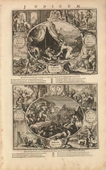 Nice lot of copper engraved illustrations from Deuteronomy, Numbers, Joshua, Judges, Ruth, I Samuel, with captions in Dutch text. There are four duplicate pages from different editions. The pictures were drawn and engraved by the famous Dutch artist Romain de Hooghe and published by Jacob Lindenberg.