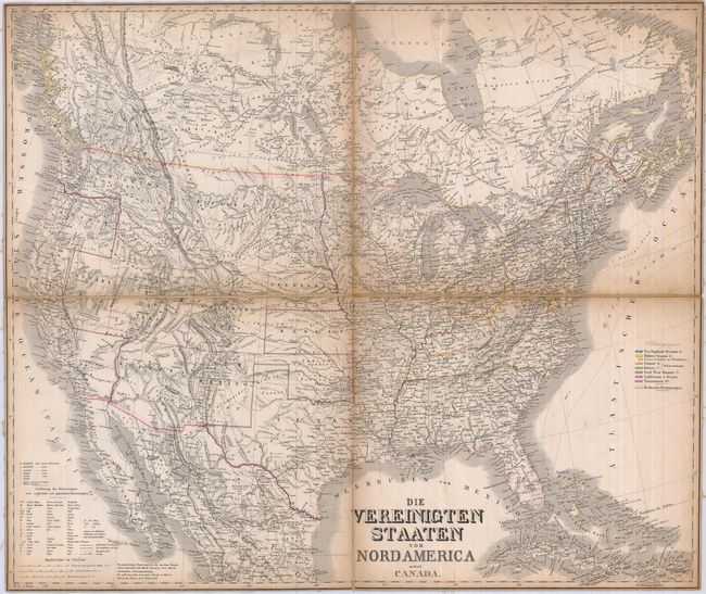 1) Die Vereinigten Staaten von Nordamerica… covers all of the United States, most of Canada, and a little bit of Mexico. There are several large territories in the western United States; many with provisional and/or spurious boundaries. The region of Montana and Wyoming is labeled Chippewa Terr.. Washington wraps around Oregon and takes in most of what would become Idaho. There is a large Dacota Territory. Nebraska is lacking its panhandle. Nevada Territory is sandwiched between an enlarged Utah Territory and a very misshapen California, reflecting a failed territorial configuration that would have taken land from California on the eastern side of the Sierra Nevada mountains. Arizona Territory is too large due to a misplaced eastern boundary with New Mexico (25 x 21").