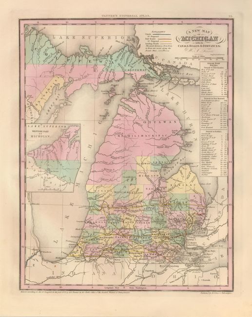 This is a great early map of Michigan with county development in the southern part of the state. The map was issued just prior to the massive county development that organized the Michilimackinac and Chippewa Districts. There is very little settlement shown above Saginaw and Lansing, the present-day state capital, is not even on the map. Canals and railroads are shown only in the extreme southern portion, highlighted in red and emanating in large part from Detroit. The left portion of the map is inset with the Western Part of Michigan. A table to the right gives the cities and distances along the steamboat routes from Detroit to Fort Gratiot, Detroit to Fort Howard, and Detroit to Buffalo.
