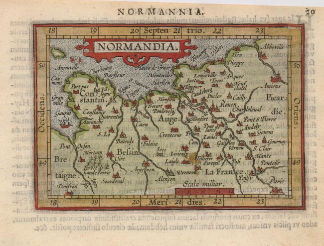Handsome map of Normandy with the title in a strapwork cartouche. It was engraved by the brothers Ambrose and Ferdinand Arsenius who had been assistants to Frans Hogenburg and co-engravers of Ortelius' folio Theatrum. This series of maps was accompanied by text by Michel Coignet and was published by Jan B. Vrients. Latin text on verso.