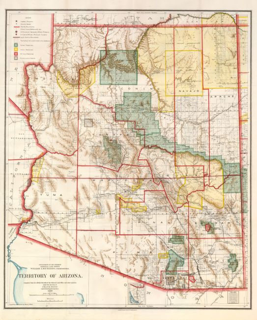 This is a colorful and fascinating map that carries detail of the territory just nine years before attaining statehood. The extent of nine Indian reservations and at least four Military reservations, including Fort Apache, are clearly shown in different colors. Private claims, confirmed and unconfirmed, are outlined in red. The Grand Canyon Forest Reserve is shown. Brown hachured mountainous areas and the blue waterways combine to provide great visual impact. Details include watershed, mountains, railroads, wagon roads, private claims, unsurveyed townships, etc. Of note, this is the first map to name Sedona, here called Sedonia.