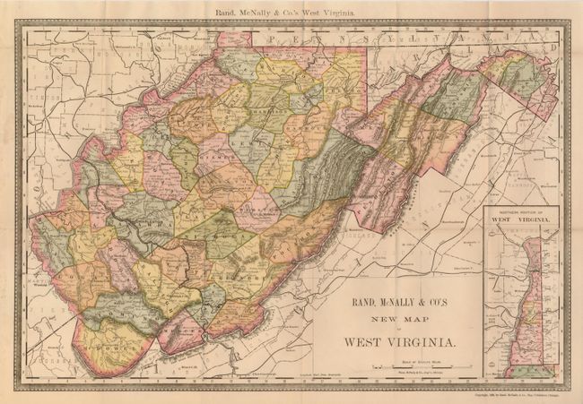 This detailed pocket map "Rand McNally & Co.'s New Map of West Virginia" has each county individually colored and includes the inset "Northern Portion of West Virginia" drawn on the same scale. Surrounded by a decorative border and blank on verso. The 36 page guide book has several pages of early advertisements. Original brown paper covers with a fabulous advertisement on back cover for the Phoenix Hotel at Las Vegas Hot Springs on the Santa Fe Route, touting it as "The Karlsbad of America" with "Mineral Waters adapted to the cure of all Chronic Infirmities."