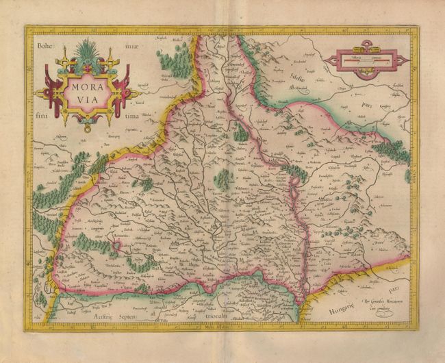 A handsome map of the historic Moravia region of the Czech Republic that includes the cities of Olomouc (Olmutz) and Brno (Brunn). Finely engraved with mountains, forests and even the smallest villages, it is decorated with strapwork title and scale cartouches. Latin text on verso.