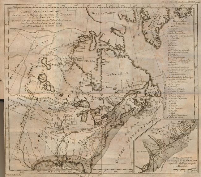 These two rare maps are still bound in the original Premiere Suite des Memoires de mathematique et de Physique… Tome Second by Jean Ttienne Guettard. The first map represents Guettard's efforts to create the first geological map of North America. Drawn by Philippe Buache, the map has an ambitious legend identifying an amazing 39 different geological formations and types. The map also has interest for its inclusion of the cartographic curiosity Mer de l'Ouest (Sea of the West) that is shown as occupying part of western Canada. This imaginary feature appeared in a series of Buache's maps of North America and its derivatives, each showing the sea shrinking in size and prominence as continuing exploration failed to prove its existence. The inset map at lower left notes eight places containing fossils. The second map is "Carte Mineralogique de la Suisse par Philippe Buache pour servir aux recherches et pour un Memoire de Mr. Guettard en 1572", (13 x 9.5"), uncolored. This map, also drawn by Buache, is the first geological map of Switzerland. It extends from Geneva in the southwest to Constance in the northeast. It identifies even more categories of geological formations than the map of North America, over fifty by our count.