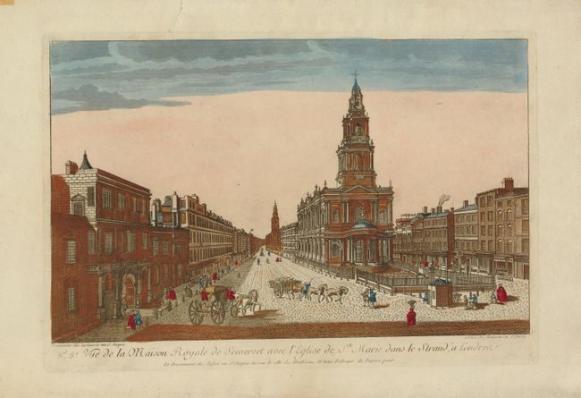 Attractive pair of unusual views depicting London in the eighteenth century. Both scenes are filled with a variety of carriages and carts in the streets and display the great architecture. The first view shows Somerset House with St. Mary's Church in the Strand London. The second view shows the Royal Exchange, which was designed by Edward Jerman and built in 1669, and was destroyed by fire in 1838. The prints bear the imprints of three different Parisian publishers; La Caussee, Daumont, and Basset.