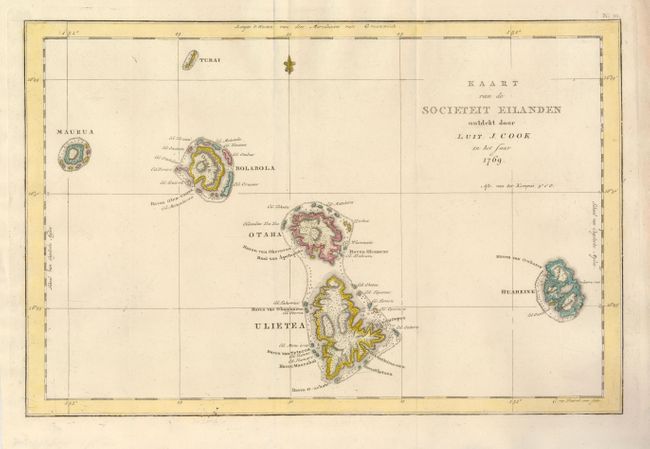 2) This map of the Society Islands details the islands located northeast of Tahiti. The map is centered on the islands of Raiatea and Tahaa (Ulietea and Otaha) and includes Maupiti (Maurua), Tupai Atoll (Tubai), Bora-Bora (Bolabola), and Huahine (Huaheine) The map is very detailed and includes the coral reefs that surround the islands with relief shown by hachures. This map was engraved by C. van Baarsel and published in a Dutch edition (16.8 x 11").