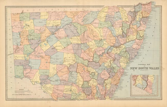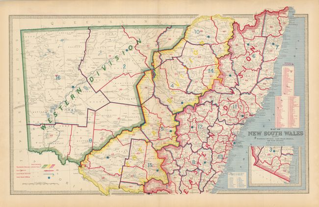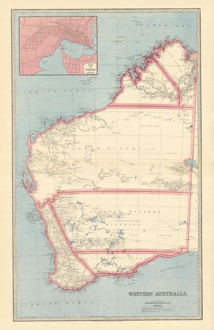 Lot consists of nine double-page and two full-page maps. The seven geo-political maps are Australia; Northern Territory of South Australia (11 x 14.5"); South Australia (11 x 14.5"); Victoria; New South Wales; Queensland and Western Australia. The other four maps are thematic: two display the annual rainfall in Victoria and New South Wales with varying sized circles. The last two thematic maps cover New South Wales detailing the land districts, stock information, wells, and "Trucking Stations." Within the maps are insets of several city plans including Port Phillip Bay and Surroundings; City of Adelaide; and City of Perth. These uncommon Australian produced maps were printed in Sydney and Melbourne.