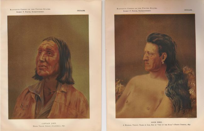 Notable among the collotype prints are the portrait of Washakie (Chief of the Southern Shoshones); Sioux Camp. Standing Rock Agency; and the large and spectacular Omaha Dance (folded, 18 x 7"). Other scenes from Indian life include: Hunting Party of Shoshones showing three mounted warriors; Piah a portrait of a handsome Ute Chief; Navajo Hogan or House; and several more. Artists include Gilbert Gaul, Julian Scott, and Walter Shirlaw. A lovely set of collotypes.