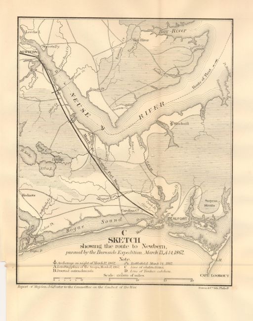 3) C. Sketch Showing the Route to Newbern, Pursued by the Burnside Expedition, March 13, & 14, 1862. (7 x 8.5"). Centered on the mouth of the Neuse River the map extends from Newbern to Beaufort. Locates Bay River, Hadnots, Smyrana Straits, Morehead City, Carolina City and the railroad between Newbern and Beaufort. Notes explain the anchorage, battlefield, obstructions, and the Line of Yankee catchers. (A)