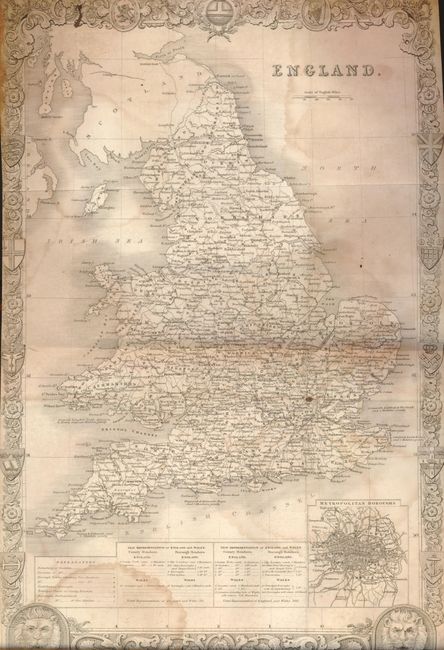 This complete two volume atlas is filled with very attractive maps including, as the title continues, a "Map of London, and a Complete Series of County Maps." Moule was an authority on heraldry and most of his maps here are embellished with armorials, vignettes and other features. This is considered the last series of British maps published in the tradition of decorative armorial cartography. Typical of many maps is Kent which is decorated with a complicated border with coats-of-arms and other embellishments, fine views of Rochester and Dover in bottom corners, and the large inset view "Greenwich Hospital" at upper right. Volume I has approximately thirty engraved maps including the large folding "Metropolitan Boughs," the circular Environs of London map, five maps of England, the thematic Principle Hills in Great Britain and another 23 county maps. Volume II has approximately 27 county maps including the Isle of Man with a crowned allegorical female figure holding the pennant of Mona, the ancient Roman name for the island. The 4to volumes are hardbound in old cloth with quarter red leather. Both with frontis and two title pages, text (vol. 1 484pp; vol. 2 582pp), maps, both share an extensive common index locating volume one or two and the page number for thousands of places. Published in London by George Virtue.
