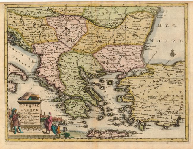 This map covers the southern part of the Balkan peninsula, eastern Turkey and the Greek Archipelago including Crete. The pictorial title cartouche illustrates wealthy Turkish merchants.