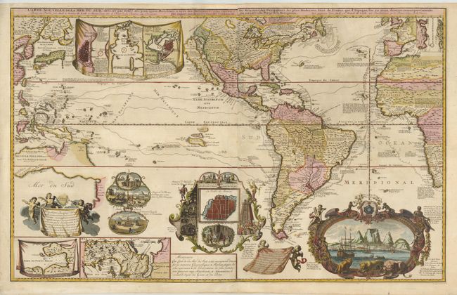 De Leth's extraordinary map is one of the most decorative ever engraved. This magnificent map is partly based on de Fer's extremely rare 1698 wall map. It is centered on the Americas and includes both the Atlantic and Pacific Ocean basins; thus including the western parts of Europe and Africa and the eastern coast of Asia, part of the East Indies, and part of Australia and New Zealand. Cartographically, it follows French models and presents the island of California on the Sanson model. The British colonies are confined to the Atlantic coast with the French controlling the broad middle of North America. The Great Lakes are well formed and the Mississippi flows into the Gulf on Mexico on the Texas coast. In the Pacific the mythical Terre de Quir is nearly joined to the northern coastline of Australia, and the southwestern coastline (with notations of the Dutch discoveries of the early 17th century) is joined with the coastline of New Zealand forming a wildly inaccurate landmass. Overall the map includes a wealth of geographical and historical information, including commercial sea routes and the paths of famous explorers. There are six detailed inset plans of the important port cities of Veracruz, Rio de Janeiro, and Havana, the bay of Porto Bello, the isthmus of Panama, and the Strait of Gibraltar. One cartouche at lower center is surmounted by a plan of Mexico City surrounded with scenes of cannibalism and human sacrifice, and another elaborate cartouche contains a dramatic view of Table Bay at the Cape of Good Hope. The map is a tour de force of decorative mapmaking and a spectacular example of the golden age of Dutch cartography.