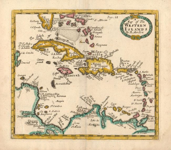 This scarce little map of the West Indies covers from the southern tip of Florida and the Bahamas through the Caribbean coastlines of Central and South America. The title is enclosed in a wreath-style cartouche. Blank verso.