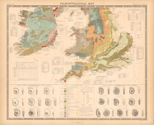 These are actually matching maps that together describe the geology of Great Britain. The first map is the northern sheet which carries the full title in a panel with engraved vignettes of skeletons, fossils, and the head of a Saber-toothed Tiger. The lower sheet contains the legend which identifies an amazing 25 different formations with hand coloring and engraved texture. To the sides of the legend are numerous fossil Ammonites. Both sheets are filled with notations and tables. The maps are from the Sketches and Notes of Professor Edward Forbes, F.R.S., President of the Royal Geological Society. Surrounded by keyboard-style border. Blank verso.