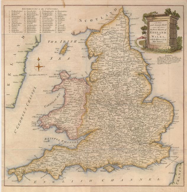 The extensive postal road system throughout England and Wales is the subject of this attractive map. The distances are given between towns and as noted below the cartouche, the "Figures when added together will shew the Distance from London to any part of England." The cartouche is engraved onto the face of a mile stone and the counties are listed at upper right.