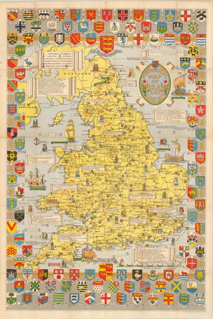 This great tourist pocket map is drawn in the whimsical cartoon-style that was a popular culture art form in the first half of the 20th century. Scattered throughout the map are figures with captions, such as A Highwayman 18th Century; A Spanish Galleon; Defeat of Richard III Bosworth - 1485; Highlanders 1745 Rebellion; and many more. The map is also filled with famous quotes from literary works, each contained in small scrolls, such as "This is the deadly spite that angers me, My wife can speak no English, I no Welsh - Mortimer in Henry the Fourth." A decorative title cartouche and legend locates Cathedrals, Abbey's Castles, Sea Ports, Holiday Centres & Spas, Principal Battles (ancient as well as air battles of WWII), Main Trunk Roads, and more. The whole is enclosed in a colorful border made up of hundreds of coats of arms. Folded and linen backed with paper labels with the same title cartouche. The back cover advertises "The Children's Map of London."