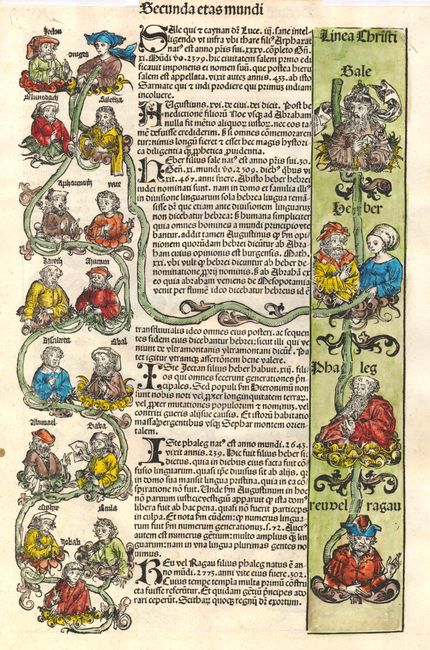 Hartmann Schedel's Nuremberg Chronicle (Liber Chronicarum) was published in two editions, Latin and German, both in 1493, appearing in print just before Christopher Columbus' discoveries completely re-shaped the European view of the World. This splendid work presented the history of the world in a pictorial encyclopedia with approximately 285 pages of text and 1,800 woodcut illustrations. Among these illustrations are views of towns and cities throughout Europe and the Near East. The majority of these views are entirely imaginary. In fact, 49 of the views are actually printed from the same group of 14 woodblocks. There are also 30 double-page views of cities with more realistic images. In addition to the topographical images, there are an enormous number of other subjects, including diagrams of the Creation, comets, family trees, portraits & biblical scenes. The text was compiled and edited by Hartmann Schedel, printed by Anton Koberger, with illustrations designed by Michael Wohlgemuth and Willem Pleydenwurff, who cut the woodblocks, probably with the assistance of their apprentice, Albrecht Durer.