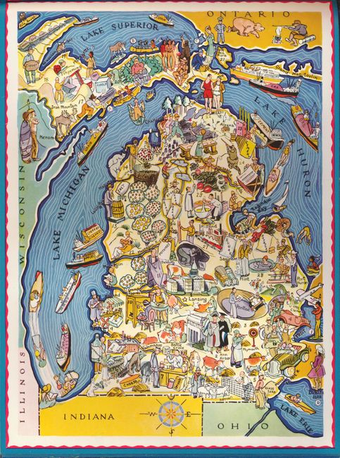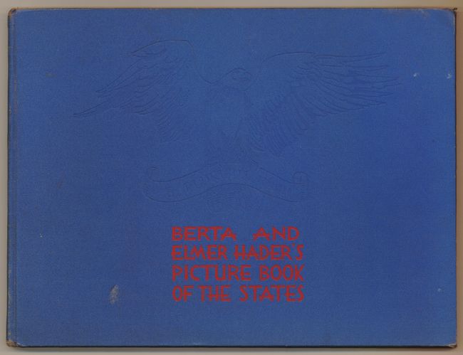 This remarkable book is filled with pictorial maps of the forty-eight states and the District of Columbia with a page of descriptive text keyed to the illustrations. Most of the maps show two states, but Texas, California, Michigan, Florida, Virginia, New York, Massachusetts and Maine have their own page. Each map is fully illustrated in a fanciful and quaint style reminiscent of the times. This book is rarely found whole as they are often broken up and sold as individual maps. Hader is probably best known for his dust cover illustration for Steinbeck's The Grapes of Wrath. First edition. Hardbound in blue colored cloth with embossed eagle and "E. Pluribus Unum" above the title in red. Published by the Junior Literary Guild of New York.