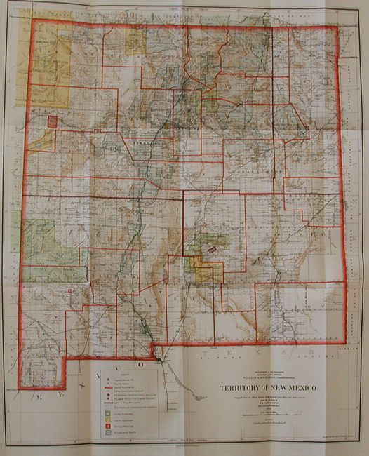 5. Territory of New Mexico, Frank Bond, 1903, (18" x 22"). This colorful and fascinating map was published only nine years before New Mexico obtained statehood. The extent of existing Indian reservations, Military reservations, Forest Reserves and Private Land Grants is shown through color and hash. Townships containing coal or probably containing coal are also colored, combining to provide great visual impact. The map is filled with information on watershed, mountains, railroads, wagon roads, unsurveyed townships, etc. In 1903, Guadalupe county was renamed Leonard Wood and then returned to Guadalupe in 1905. This is the only map we are aware of that shows that short-lived county of Leonard Wood.
