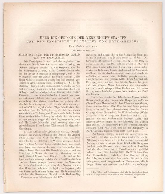 The map is with the original report "Uber die Geologie der Vereinigten Staaten und der Englishchen Provinzen von Nord-Amerika..." German text, octavo, 12 pp. In Marcou 48 the author proudly, if not immodestly, boasts "It is the first geological map comprising the whole country from the Atlantic to the Pacific Oceans, the author being the first geologist to cross the continent with a Government expedition - the Pacific Railroad exploration." An uncommon edition of Marcou's scarce map.