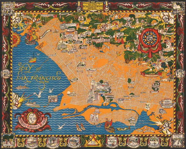 This scarce map with its bold color and wonderful artwork is more a work of art than a map. A beautiful Art Deco-style map designed by Michael Baltekal-Goodman, in collaboration with Professor Eugene Neumaus. It shows the greater Oakland-Berkley-Alameda area with all major streets named and features scores of illustrations of important buildings and sights in the area. The amazing, colorful and boldly engraved border is filled with Art Deco icons, a dozen images of local historical events, some quite quirky, and sea-horse panels separating the images. The map itself is vividly engraved and colored in brilliant orange, blue, green, yellow, white and black. Further embellished with wind heads, fancy cartouches and the sea contains quaint depictions of sail boats, ferries, freighters, ancient sailing ships and sea monsters. The style is similar to Jo Mora but much bolder. Folds into the original 11"x 12" decorative envelope, the front of which is the same as the upper left portion of the map with the addition of a title square. Published by the Sather Gate Book Shop of Berkeley and printed by Union Litho. of San Francisco & Oakland.
