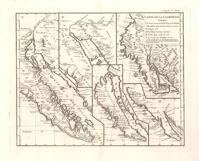 This sheet has five depictions of California that present a fascinating cartographic history of the region. The first map reproduces Neron Pecci's map of 1604 showing the peninsula with a ragged coastline and place names derived from Cabrillo's voyage of 1542-3. The second map is a detail from Sanson's 1656 map showing the island of California with place names from the voyage of Vizcaino. Map three is from Delisle's map of America of 1700 with the question of California's insularity left open to interpretation. Map four is Kino's important map of 1705 that finally ended that cartographic myth. Finally, map five is a portion of a Spanish map, showing the Jesuit explorations, that first appeared in Miguel Venegas' Noticia de la California in 1757, which is the first published history of California. This is an important map for any California map collection.