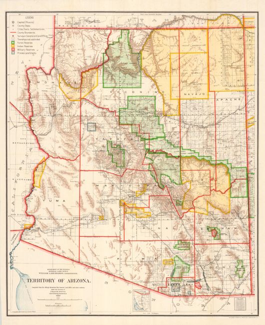 A colorful and fascinating map that provides a detailed look at the territory just seven years before statehood. The extent of nine Indian reservations and three Military reservations, including Fort Apache, and numerous National Forest Reserves are clearly shown in different colors. Private claims, confirmed and unconfirmed, are outlined in red. The Grand Canyon Forest Reserve is shown. Brown hachured mountainous areas and blue waterways combine to provide great visual impact. Details include watershed, mountains, railroads, wagon roads, private claims, unsurveyed townships, etc. This map initially appears identical to the 1903 edition, but closer study shows subtle but important differences. Drawn by Daniel O'Hare, and lithographed by the Norris Peters Co., Photo-Litho. This spectacular example is folding, as issue.