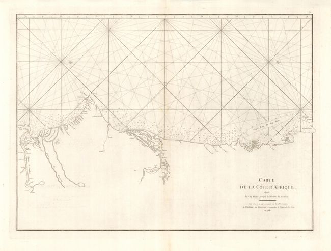 A handsome sea chart draws the coastline of Senegal and Gambia. The coastline is carefully delineated to illustrate the sandbars, rocks, and soundings. The mouths of the Senegal and Gambia rivers are shown in great detail. Several villages are located along the coastline and rivers.