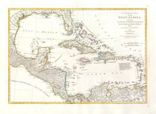 This scarce map was drawn by Samuel Dunn, Mathematician … Printed for Robt. Sayer, No. 53, Fleet Street - as the Act directs, 10 June, 1786. It shows information on coastal features and limited interior detail including watershed and larger towns. It extends to include an interesting depiction of Florida and south to show the northern portion of South America. The area of today's Belize is labeled Logwood Cutters referring to the British cutting of logwood, greatly valued in Europe as the principal dyestuff for the expanding wool industry. By the 1770s, mahogany replaced logwood as the main export from Belize. The map carries a notation explaining how the Windward and Leeward Islands came to be known. This is a later edition of the map which appeared in the American Military Pocket Atlas with the same title. Page 41 is at upper and lower right corners just outside the neatline.