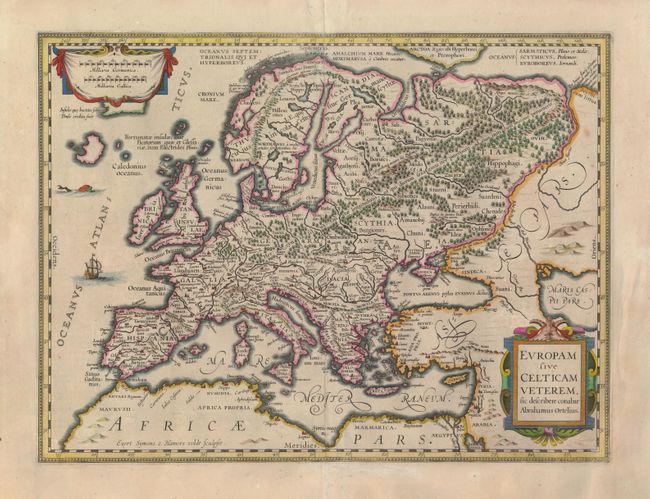 This is an uncommon variant of the map Jansson issued in his historical atlas. It is based on Ortelius' map of the same title, and credits him in the title cartouche. It covers Celtic Europe and is fully engraved with forests, mountains and rivers, and there are several ancient tribal and place names. The map bears the same engraver's imprint of Everard Symonsz Hamersveldt and the cartographic content remains unchanged, but the cartouches have been simplified.