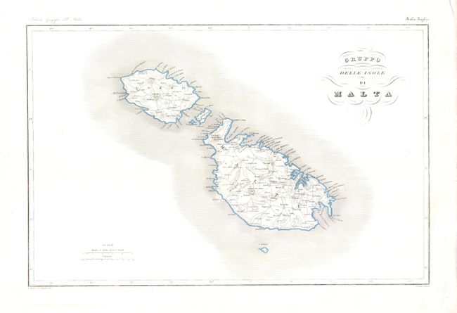 This uncommon and handsome map of the islands of Malta and Gozo presents excellent detail of the towns, fortifications, roads and harbors. Drawn by Giacinto Maina and V. Stanghi and engraved by G. Pozzi.