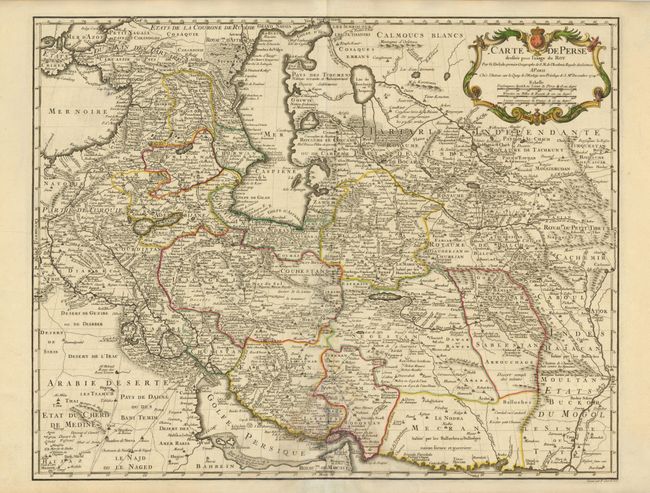 Handsome map of the region stretching from the Caucasus through Afghanistan and from the Arabian Desert to the Indus River. The map is filled with impressive detail including roads, bridges, forts, cities, villages, watering places and much else of interest. Finely engraved by P. Starckman with his imprint at lower right.