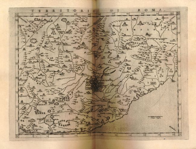 This is the third edition of Girolamo Ruscelli's translation of Claudius Ptolemy's Geographia. It was revised and corrected by Giovanni Malombra, and was printed by Giordano Ziletti. It is complete with 65 maps; 27 classic and 38 modern, which are enlarged copies of the maps created by Giacomo Gastaldi for his 1548 edition of Ptolemy. These maps demonstrate the amazing advances in geographic knowledge taking place in this great era of exploration. They are from finely engraved copper plates, which were a great improvement over the rather crude woodcut maps in many of the earlier editions. The maps are printed from the same plates as the first edition (1561) with the exception of the Ptolemaic world map, which reverted to the original conical projection of Ptolemy. This edition also includes the additional map of Territorio di Roma. There are two modern world maps; a seminal map of the eastern seaboard of North America; a map of Nueva Hispania that covers from Baja California, Mexico and Central America through Florida and the West Indies; and several other maps related to the Americas. Complete, 350 pp, index and two engraved frontispieces. Original vellum binding with three raised banks and brown ink manuscript title on spine.
