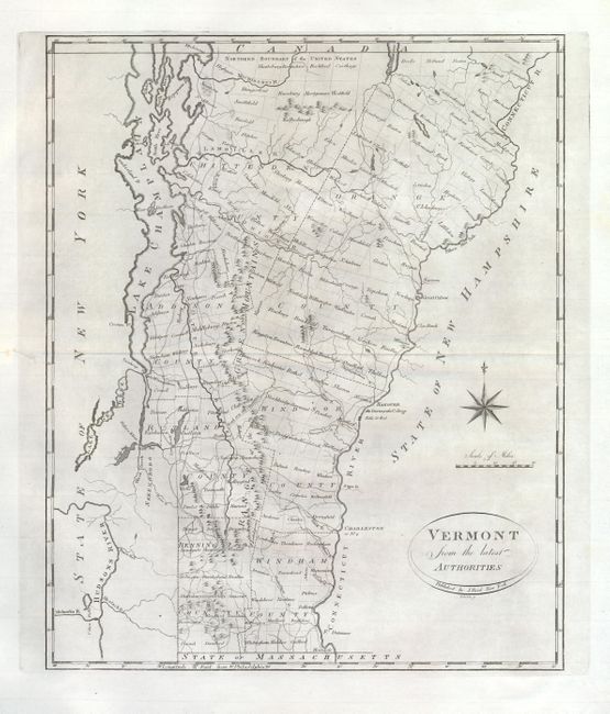 This map is the first state of Reid's map of Vermont which was copied from Mathew Carey's Vermont from the latest Surveys, 1795. The map shows the state divided into seven counties and further divided into townships, all named. Shows topography, watershed, towns and a surprisingly large network of early wagon roads. Locates and names Dartmouth College. The Ottauquechee River is here called the Waterguechec R. Large compass rose rests in the Atlantic. This map was also published in Winterbotham's America and in the [Vermont] State Papers where is was the frontis. Engraved by Roberts.
