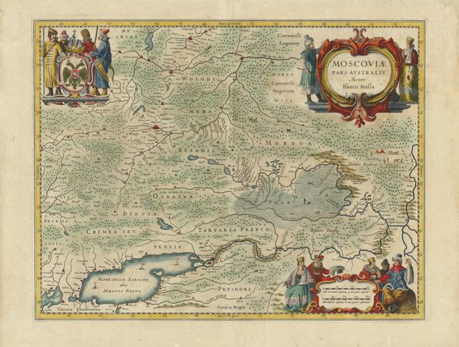 This is a very decorative map of the region north of the Sea of Azov including Moscow. The map is based on the travels of Isaac Massa, the Dutch traveler & merchant, who first visited Russia during the Time of the Troubles. When he returned to Holland in 1609 he brought a rich collection of historical, geographical, ethnographic & cartographic material that formed the basis of this and several other important maps of the region from this period. The land is fully engraved with forests and wild animals, and tiny ships sail in the sea. Three corners of the map are decorated with large cartouches, each flanked with figures depicting the royalty, Cossacks and the merchant class. French text on verso.