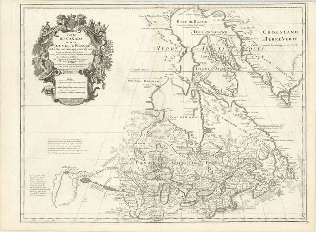First issued in 1703, this richly detailed map provides the most accurate rendering of the Great Lakes of the time, with the lakes fully enclosed and properly placed in longitude and latitude. Delisle's map of Canada and the Great Lakes is one of the most outstanding and influential maps of the eighteenth century. The Great Lakes are portrayed correctly for the first time, and Detroit marks its debut on this map, only two years after its founding. Delisle's cartography is very meticulous and adds new information from Joliet, Franquelin, and the Jesuit explorers. It correctly positions the Ohio River but confuses its name with the Wabash River. West of the Mississippi Lahontan's fictitious Riviere Longue is prominently depicted. In Canada special attention is given to the rivers and lakes between Hudson Bay and the St. Lawrence, and Lac de Assenipoils (lake Winnipeg) connects to Hudson Bay. Sanson's three islands of the Arctic are retained. Exquisite cartouche with a beaver, natives (one of whom is bearing a scalp), priest and friars, engraved by Guerard. The map remains unchanged from the first edition with et Premier Geographe du Roy added to Delisle imprint.