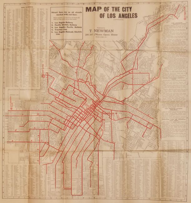 This great pocket map extends west to the L.A. Country Club at Arlington Street and Wiltshire, east to beyond Evergreen Cemetery and south to Ascot Park. With an extension to the northeast that continues the map, roughly following Figueroa Street (here named Pasadena Avenue), to Highland Park. Red overprinting radiates from downtown delineating the routes of the Los Angeles Railway, Pacific Electric Railway, Los Angeles Pacific Railway, the Traction Line, and the Los Angeles - Redondo Electric Line. Detailed route information is in a panel at the right. City street index is below and on the left. Blank verso. Folds into the booklet "Newman's Directory Guide and Handbook of Los Angeles and Southern California. Latest City and Road Maps. Price 25¢." The 96 page Guide of Los Angeles covers everything imaginable "For Strangers and Residents." Plus many unnumbered pages of pictorial advertisements including Balloon route Excursions, Morosco's Burbank Theatre, Belasco Theatre, Hotel Lankershim, the railways mentioned above and several more. Yellow paper covers, 8vo. Published by T. Newman, 204-207 Mason Opera House, Los Angeles. The population is listed as only 220,000.