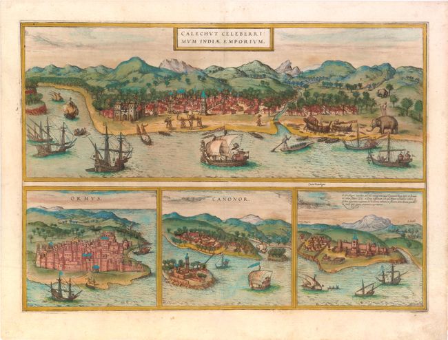 This is one of the few maps included in the Civitates Orbis Terrarum covering cities outside of Europe. The folio sheet contains four plans featuring cities important to European trade with Asia. The largest top view provides a panoramic view of the important Portuguese port of Kozhikode, India (also known as Calicut), showing a city surrounded by mountains and palm trees, with a royal procession on the beach and a working elephant to the right. At bottom left is Ormus, a city on an island and the main market of the Persian Gulf. At bottom center is Kannur, situated on the coast of Malabar, with simple houses within a forest of palm trees. At bottom right is St. George (Mina), a gold mine in Guinea, which features the castle of Sao Jorge da Mina, which was built in 1482 to protect the trading post. Latin text on verso.