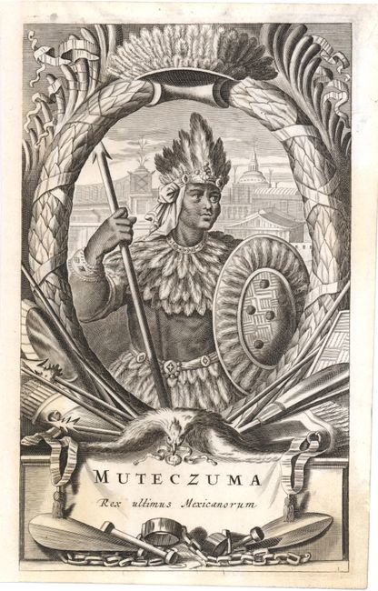 F. Muteczuma Rex Ultimus Mexicanorum. This portrait of the Aztec emperor Montezuma shows him at the time of the Spanish conquest, with Tenochtitlan (later Mexico City) depicted in the background. Montezuma wears a ceremonial headdress and bears a shield and spear. Condition: Light stains, with left side expertly remargined close to neatline. (B)