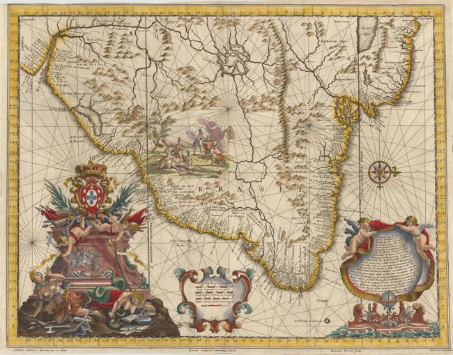 The map itself is beautifully drawn and provides excellent detail of the coastlines of Brazil, Argentina, Uruguay, French Guiana, Suriname and Guyana from Rio de la Plata in the south to beyond the mouth of the Amazon river in the north. Despite what little was known of the interior of Brazil during the time period, the interior is filled with mountains, rivers and the fictitious Porto dos Reis in Brazil and Lake Parime in Guyana. A large compass rose orients the map with north to the right. The map is elaborately adorned with two cartouches, a vignette of cannibalism, and an allegorical scene with Brazil's royal coat of arms at top with two putti holding chains restraining Hippolyta, the Amazonian Queen, and Medusa.