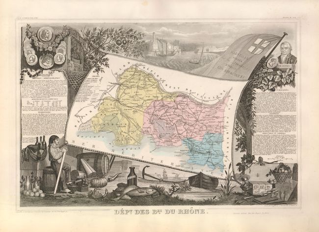Dept. des Bes. du Rhone. This map depicts Bouches-du-Rhone, named after the mouth of the Rhone River and a department in Provence in the south of France. French text on either side of the map describes the political divisions, topography, important sites, and commerce of the region. Vignettes surrounding the map feature Marseille, the capital of the department and one of the main gateways to France, including portraits of famous natives of the region, a view of the city, and the coat of arms of the city. Below the map is a vignette of the produce of the region, highlighting the fishing industry and production of olive oil.