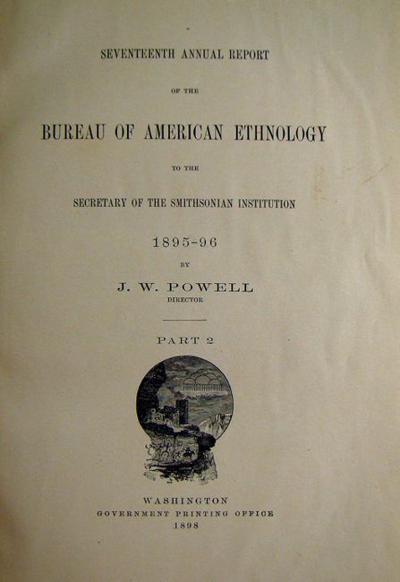 This important BAE report was published when John Wesley Powell was its director. There are two sections in this part 2 of the report. The first section is "Navaho houses", by Cosmos Mindeleff and covers pp. 469-517. The second section is "Archeological expedition to Arizona in 1895" and covers pp 519-744. Included in this volume is a "Map of Part of the Navaho Reservation" in Arizona and New Mexico. There are numerous plates, many in color, showing Navaho houses and Indian pottery. Hardbound in original green cloth bindings with gilt titles on spine and illustration of a chief on front covers.