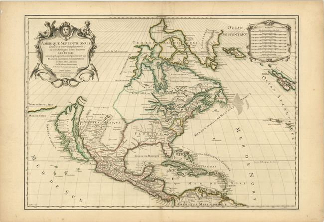 This beautiful map of the Americas shows California as an island in the style of the second Sanson model (1656) with the indented northern coastline. A small peninsula Agubela de Gato is the only part of the Pacific coastline shown north of California. A strip of Terre de Jesso is shown in the Pacific immediately west of northern California. Santa Fe is shown along the R. del Norte (Rio Grande River), but the river erroneously drains into the Gulf of California. The two western Great Lakes are open-ended, and Lake Erie is too far south, split by the 40th parallel. Politically the map shows the British colonies confined to the Eastern Seaboard and extending south only to a large Virginia. The Carolinas are labeled Floride Francoise. The large Louisiana region is labeled Floride and is shown as a Spanish possession. Beautifully engraved by Cordier. This is a slightly reduced version of his map of 1674. It can be distinguished from the early version by the size and location of the distance scale. It is also dedicated to the French King rather than to the Dauphin. This is Burden's second state with the imprint showing the date 169 (without the final digit) in the distance scale cartouche.