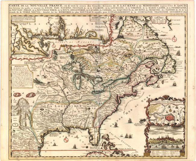 Derived from Nicholas de Fer's important four-sheet map of 1718, this is the most informative map of the French possessions in North America in the early 18th century. Louisiana and the Mississippi Valley are based on Delisle's manuscript map of 1701, while the geography of New England and eastern Canada originates with Franquelin. Inset at top left is a large-scale map of the Mississippi Delta and Mobile Bay, based on the voyage of Pierre Le Moyne d'Iberville. Another inset plan and view of Quebec is enclosed in a very decorative cartouche at bottom right. The map is filled with wildlife, scenes of Indians hunting, Indian villages and notations, and the oceans are embellished with numerous ships, canoes and sea monsters. It was issued to promote the recently established Compagnie Francoise Occident, which was formed to fund the debt of Louix XIV and offered inducements to encourage settlement in Louisiana.