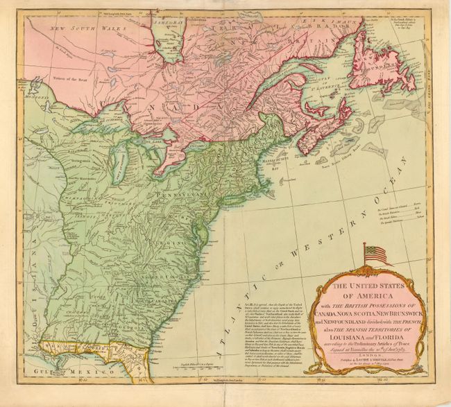 This map had a long publication history. It was prepared by Thomas Jefferys and first published in 1755, with the title North America from the French of Mr. D'Anville…, to illustrate the French and Indian War. In this fourth and final state, published by Laurie & Whittle, it illustrates the infant United States. New England is shown extending well into New Brunswick, and there are several changes in the shoal areas of the Gulf of Maine and the important nearby fishing banks. The map is extremely detailed with the locations of forts, Indian villages, tribal territory, and mines. West and East Florida are Spanish possessions. The large, decorative title cartouche is surmounted by a Stars and Stripes flag. The text of Article III of the Treaty of Paris is printed to the left of the cartouche, referring to the fishing rights of the United States.
