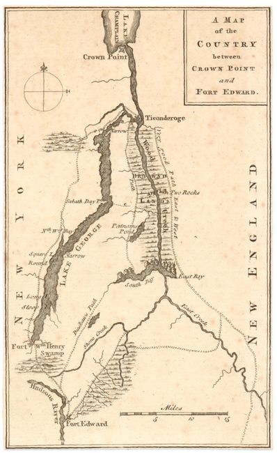 C. A Map of the Country between Crown Point and Fort Edward, Gentleman's Magazine, (4.5" x 7.5"). This map depicts the area surrounding Lake George, along the northeastern border of New York state, extending up to Lake Champlain. Several forts are shown, including Fort Ticonderoga, along with a very good path east & west next to the drown'd lands. One of the trails is labeled Dieskau's Path referring to the route taken by French and Indian forces under the command of German Baron Ludwig August Dieskau and British and Colonial troops under Sir William Johnson that resulted in a series of skirmishes and engagements known collectively as The Battle of Lake George. This battle was the first significant win against the French forces by British Provincials. Ref: Jolly #GENT-129. Condition: Trimmed to neatlines with faint foxing. (B+)