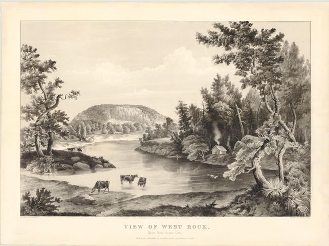 Currier and Ives was a printmaking company based in New York City from 1834-1907, producing black and white lithographs. The focus of their work was American life, cities and people, and they often employed celebrated artists of the day to render drawings to be reproduced in print form. This striking view of West Rock Ridge in south-central Connecticut depicts a small cabin and a couple by the river at right, while cows graze at left. The imprint at bottom shows Currier and Ives' address at 152 Nassau St.