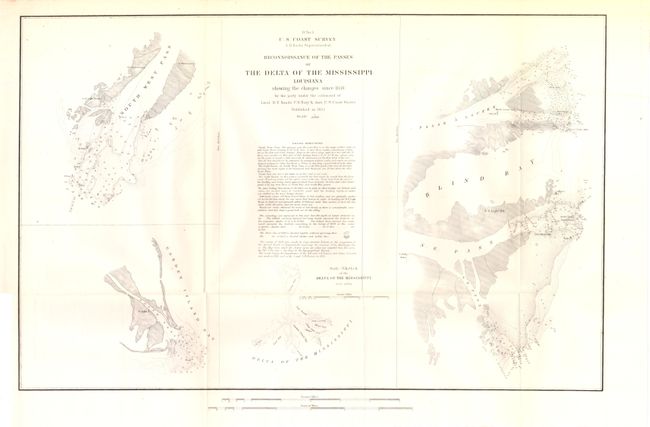 C. Reconnoissance of the Passes of the Delta of the Mississippi by the U. S. Coast Survey, dated 1852, (20.5 x 13"). This map shows four small charts on a single page, depicting Blind Bay and vicinity, South West Pass, South Pass and the Delta of the Mississippi. Sailing directions shown in the center of a nicely balanced sheet. Condition - very light even-age toning and a binding trim at lower left. (A)